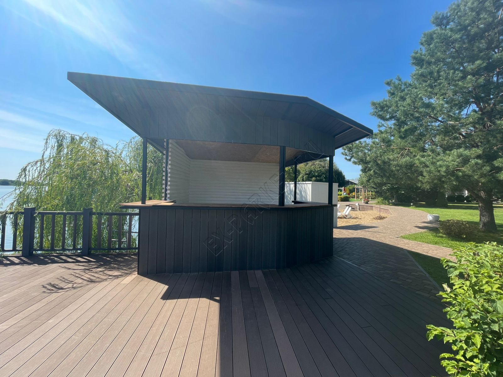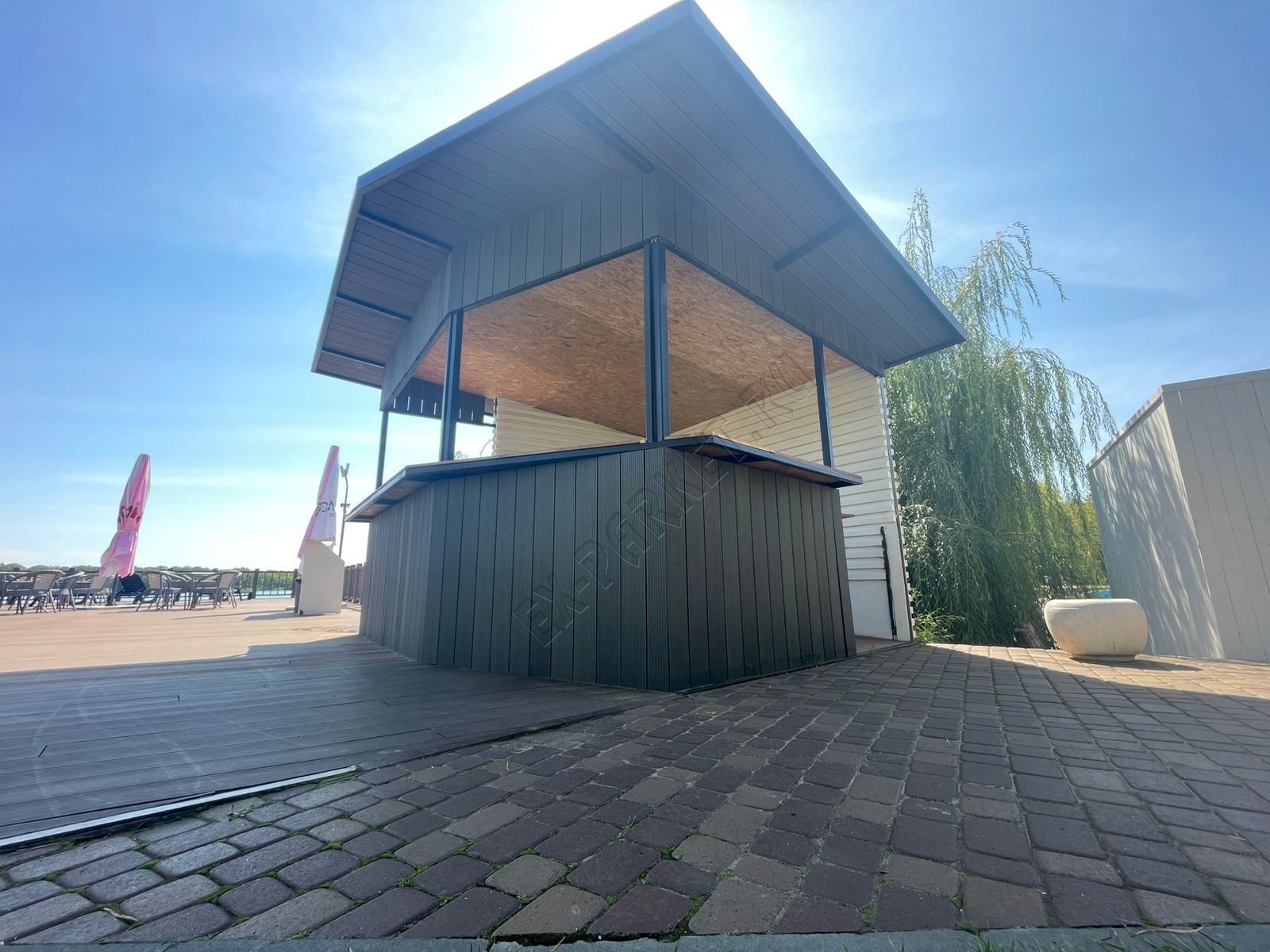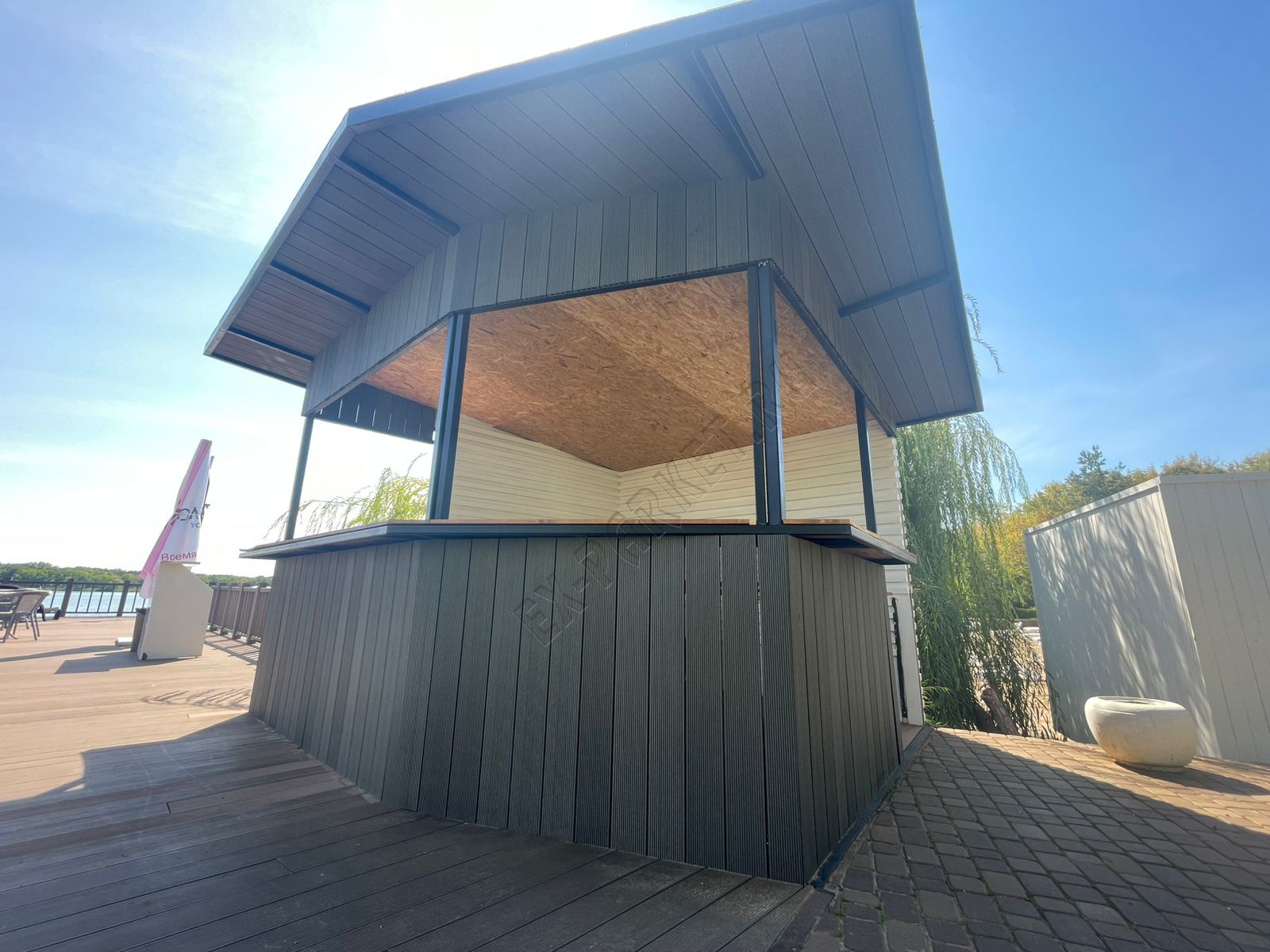 💎 В усадьбе "Волжино" появилось восхитительное новшество, созданное с любовью и заботой о гостях: удобное и стильное пространство для освежающих напитков и любимого мороженого! Это элегантное дополнение, выполненное полностью из премиальной террасной доски Good Cover цвета "графит", не только идеально вписалось в ландшафт, но и значительно повысило уровень комфорта.