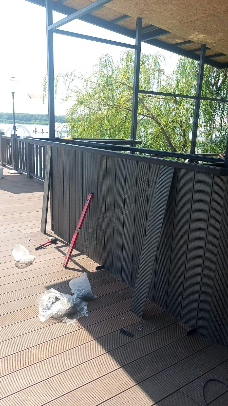 Благоустройства турбазы Волжино, монтаж террасной доски из ДПК