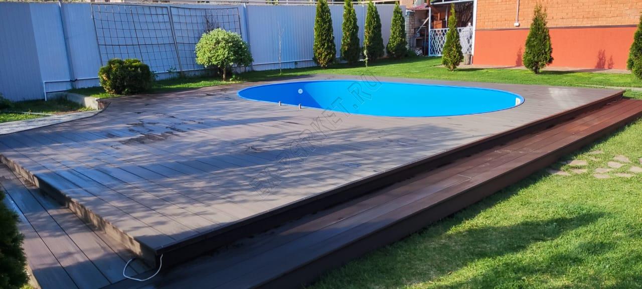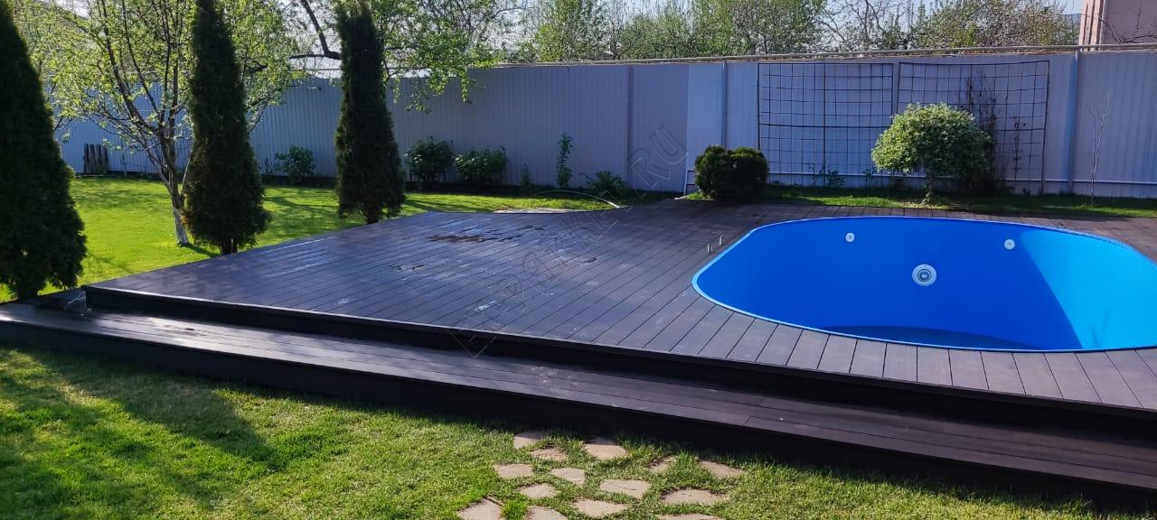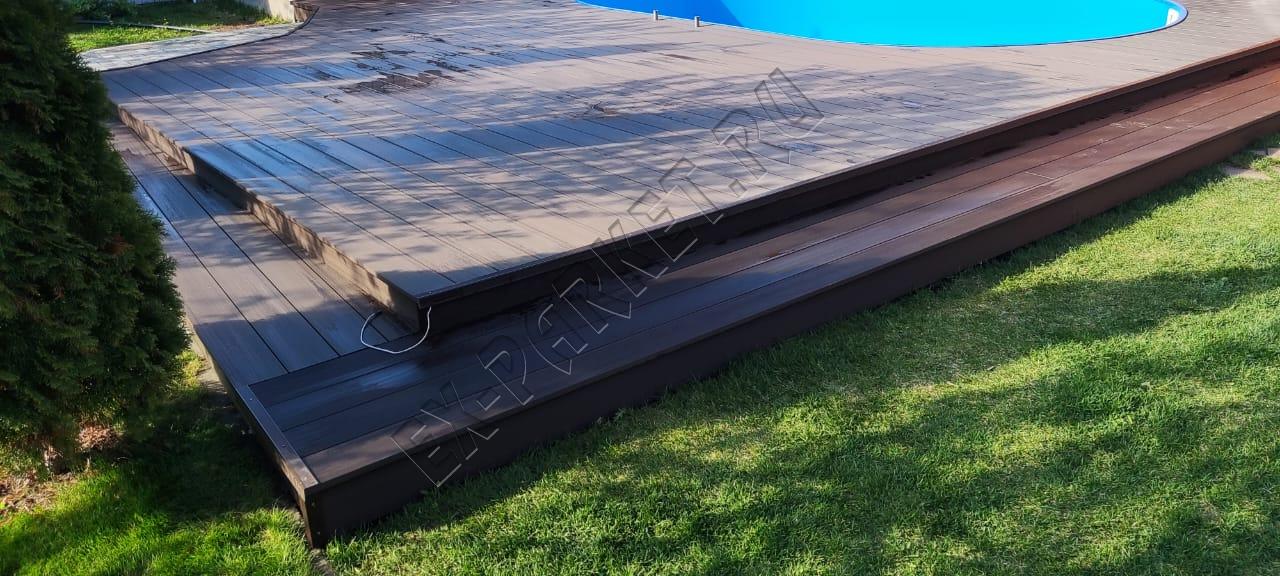 Монтаж террасной доски из ДПК SaveWood Salix вокруг бассейна
