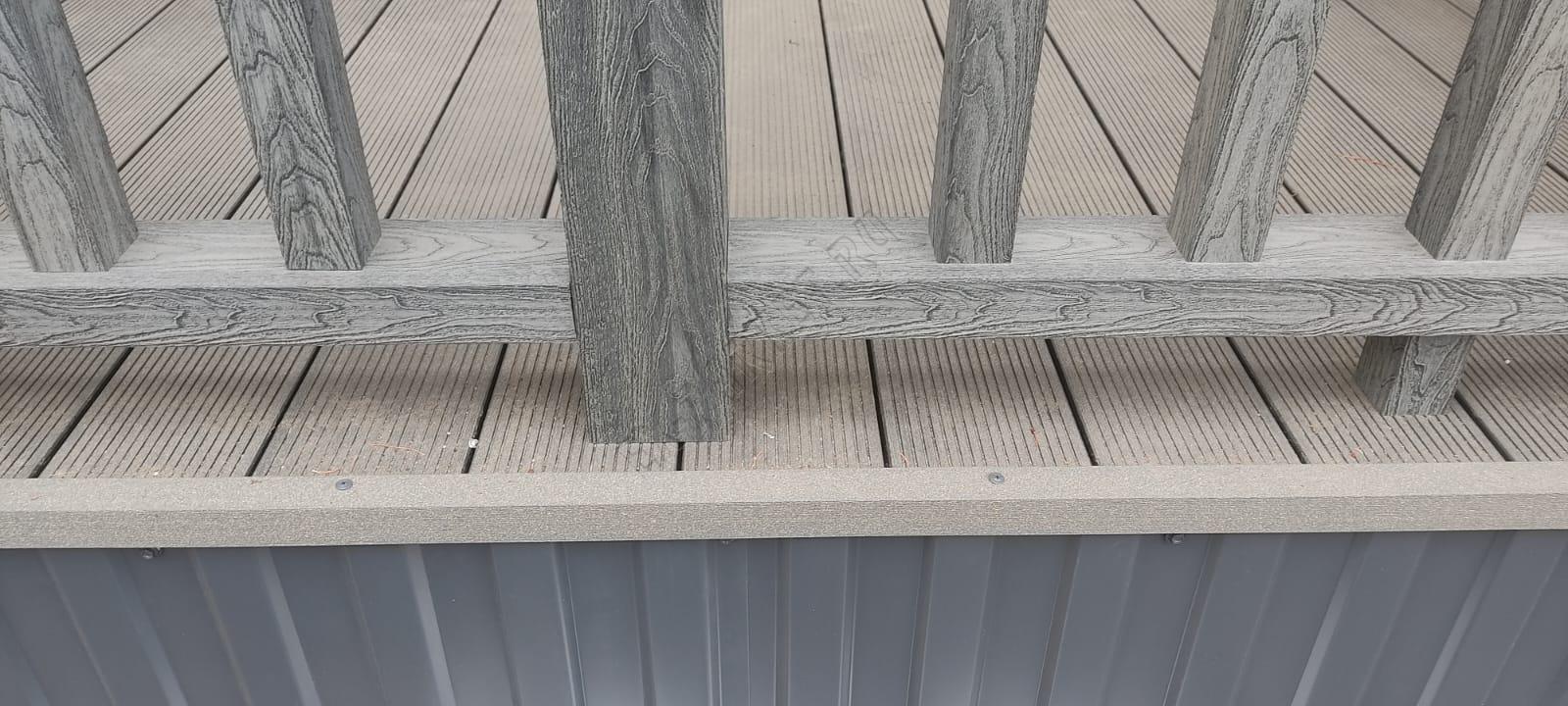 👉 Ограждения: TimberTEX с тиснением под дерево, цвет серый. Ограждения выбраны в цвет доски и придают террасе завершенный вид.