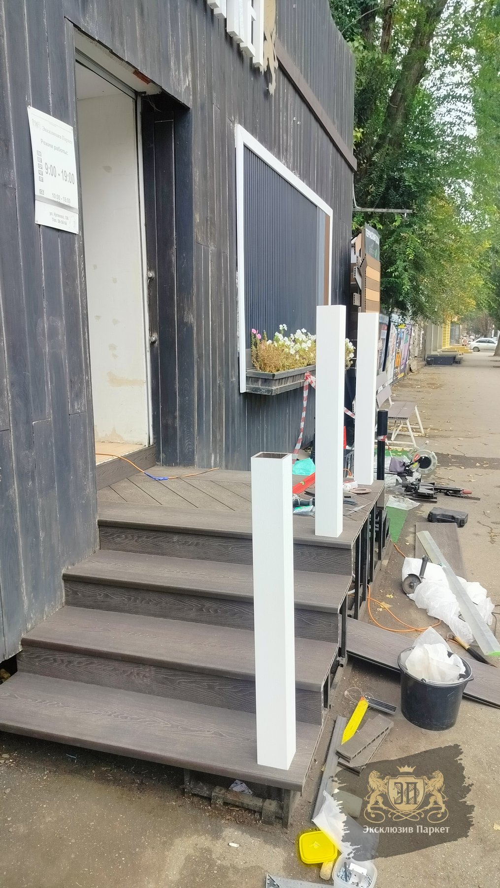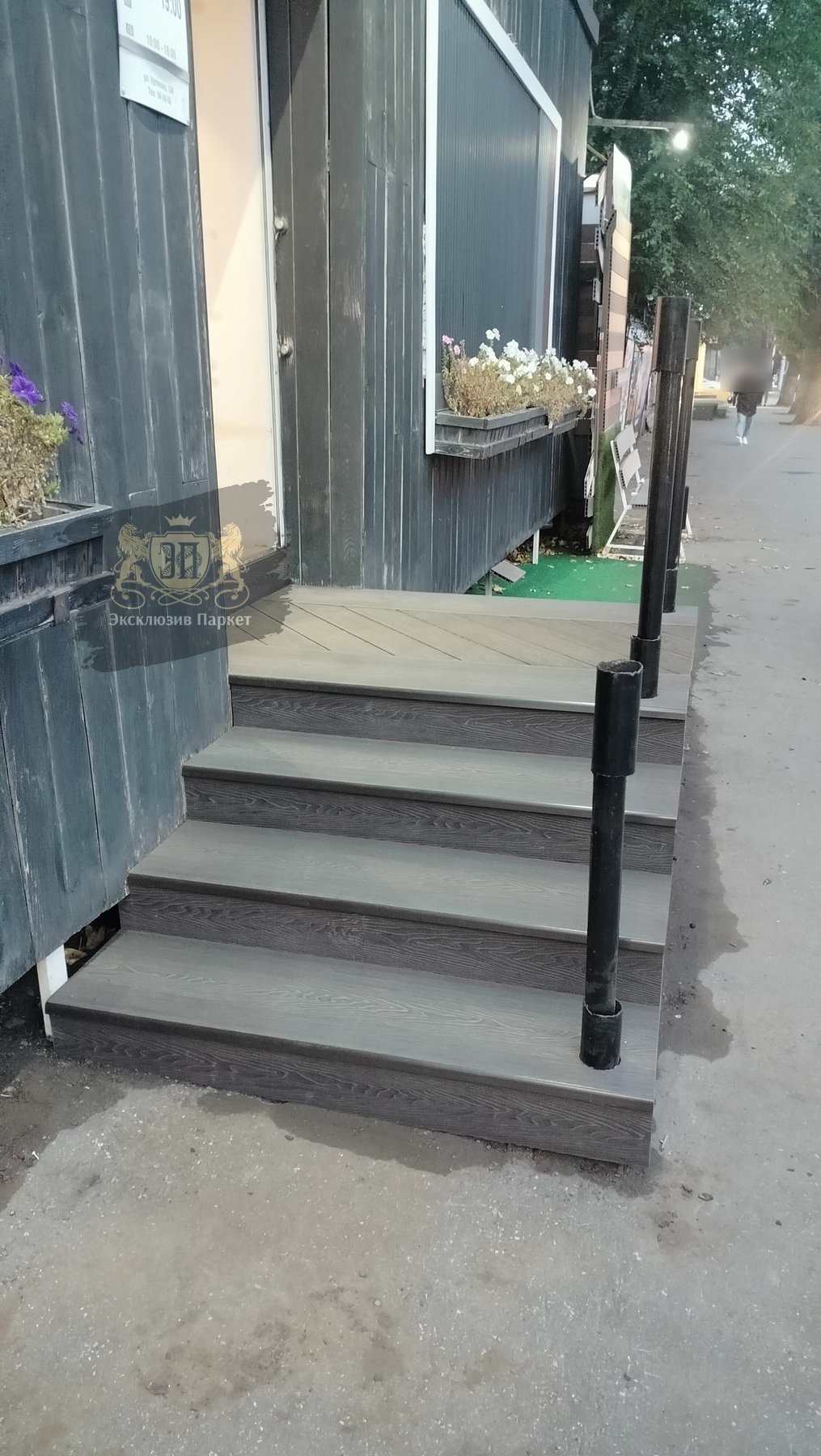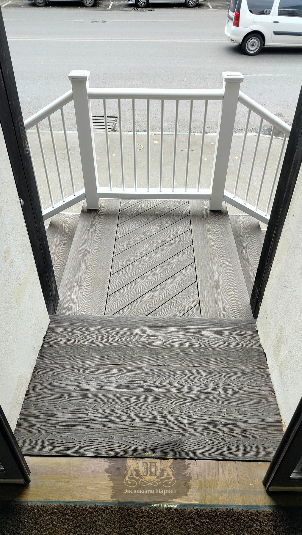 Входная группа, лестница из декинга Good Cover 3D и ограждения ДПК Woodvex