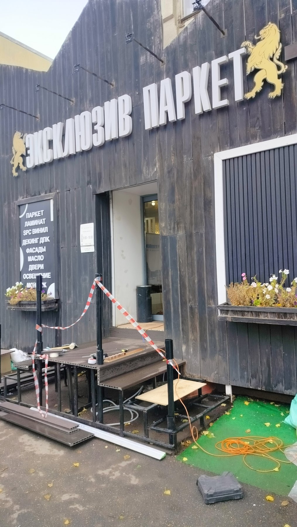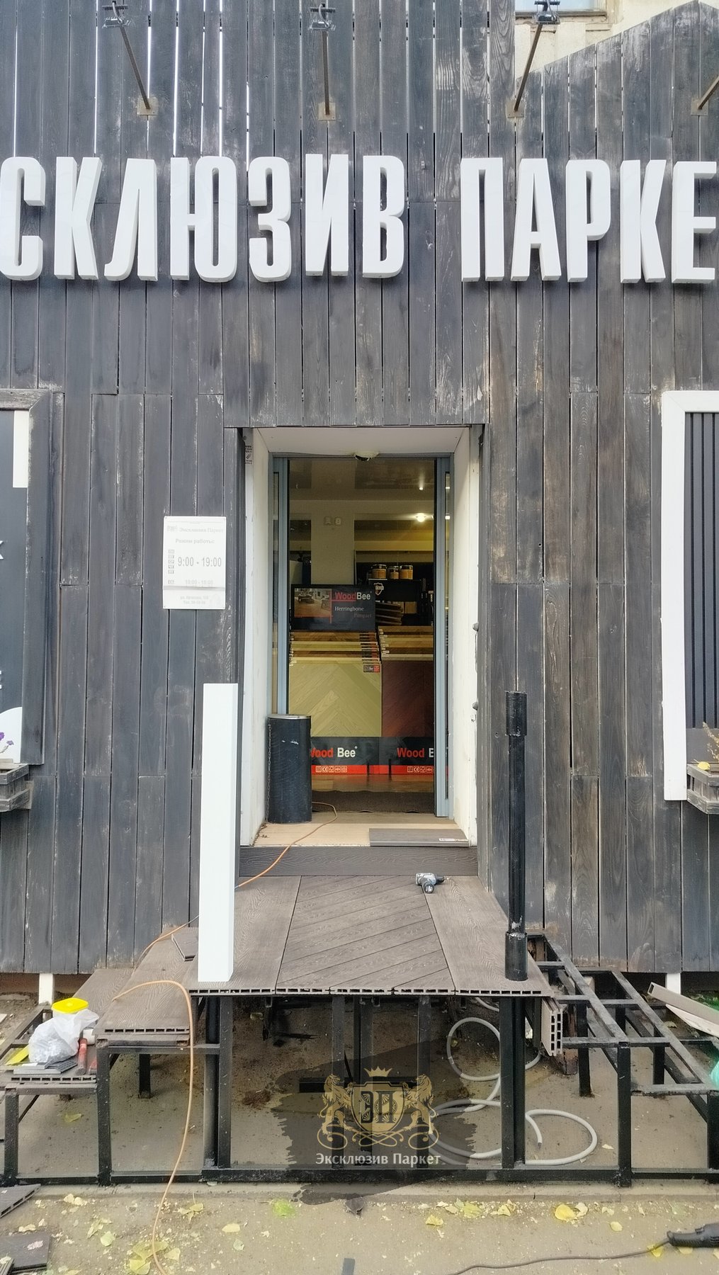 • Входная группа магазина отличается сложной конфигурацией. Для безупречного результата и долговечности ступени и доска Good Cover 3D были надёжно закреплены с использованием высококачественного итальянского клея VerMeister Repox Evo.