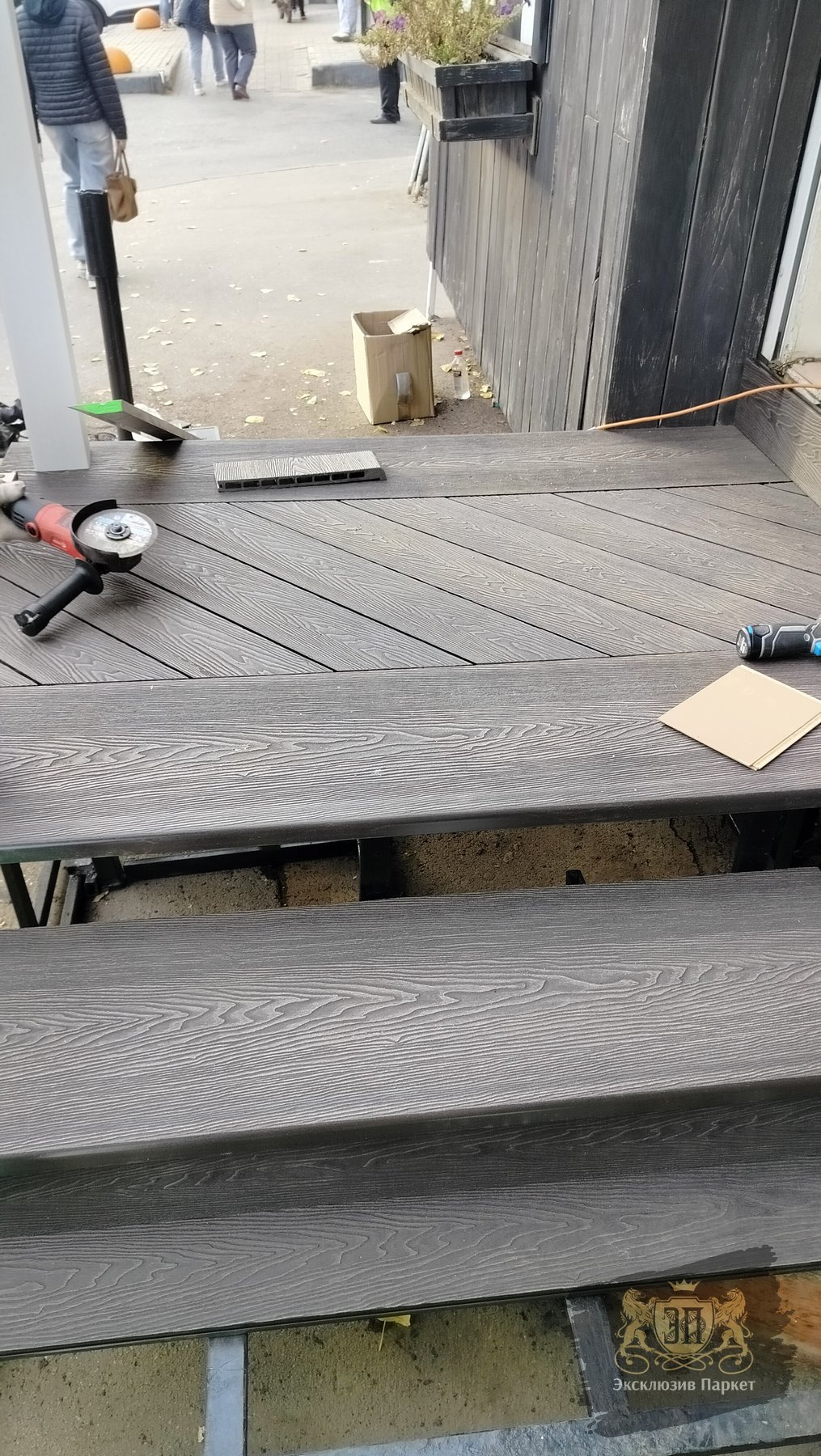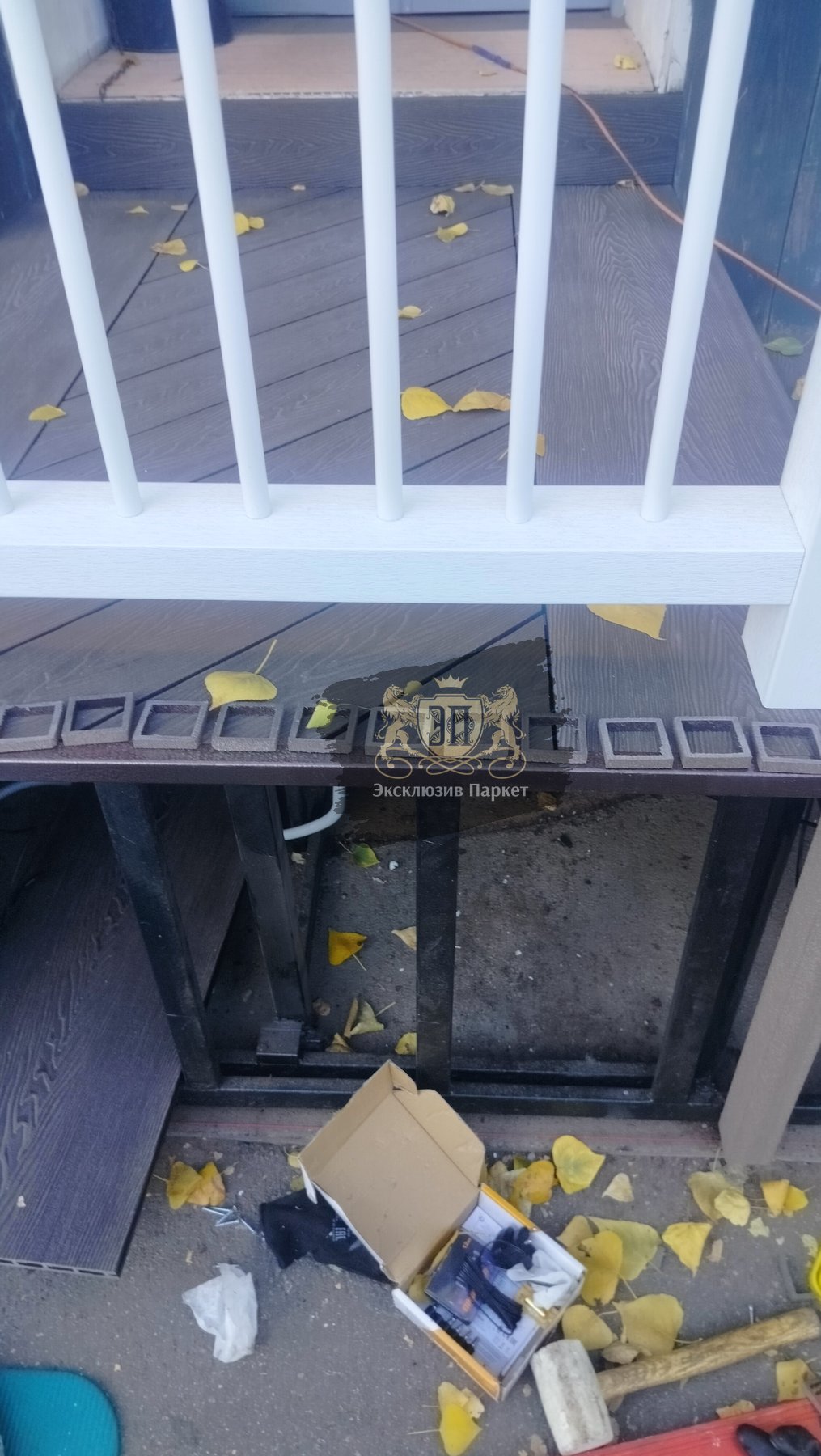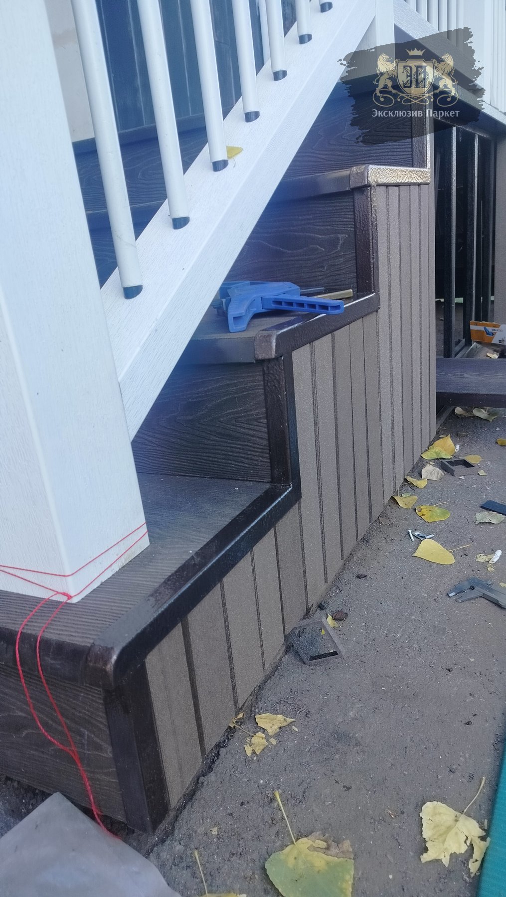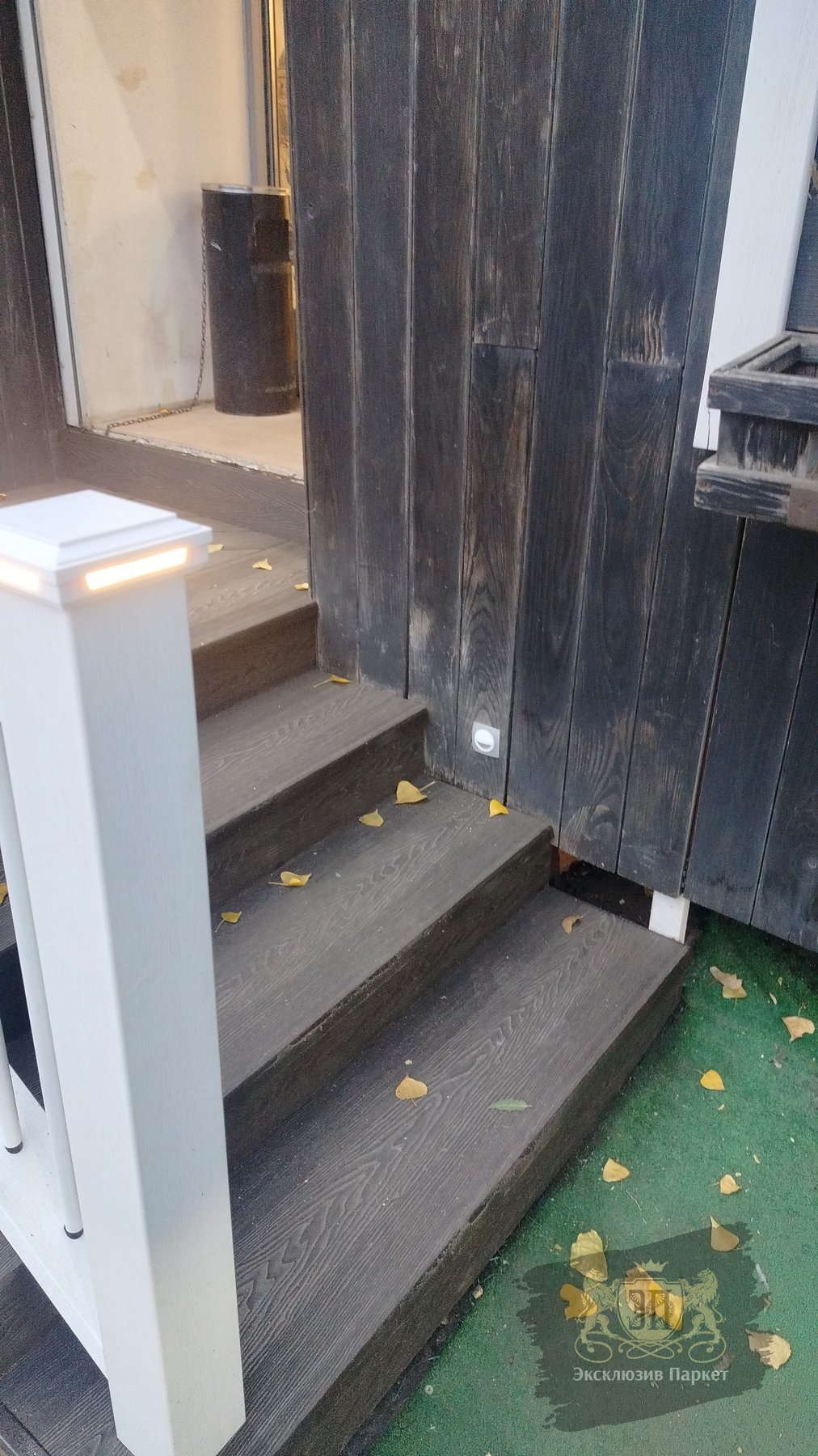 • Подступенники и площадка: Смонтированы из террасной доски ДПК Good Cover 3D 140х22х3000мм, цвет "венге".